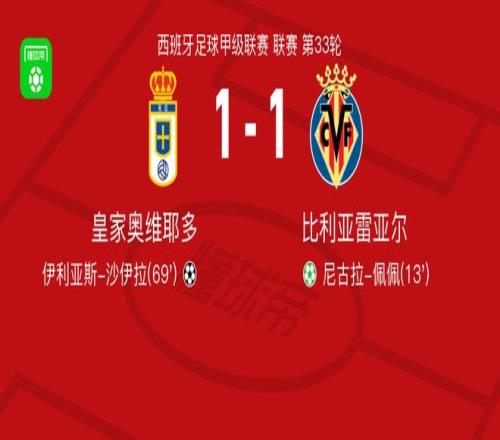 北京時間4月24日西班牙足球甲級聯賽 聯賽 第33輪,皇家奧維耶多主場對陣比利亞雷亞爾。皇家奧維耶多伊利亞斯-沙伊拉破門。比利亞雷亞爾尼古拉-佩佩破門。最終比分皇家奧維耶多 1-1 比利亞雷亞爾。
