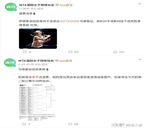 繼斯瓦泰克昨天因病退賽后,今天俄羅斯名將薩姆索諾娃也因身體不適宣布退賽,而美國新星高芙也在比賽中出現(xiàn)嘔吐等嚴重不適癥狀,但她最終還是頑強逆轉(zhuǎn)科斯蒂亞。